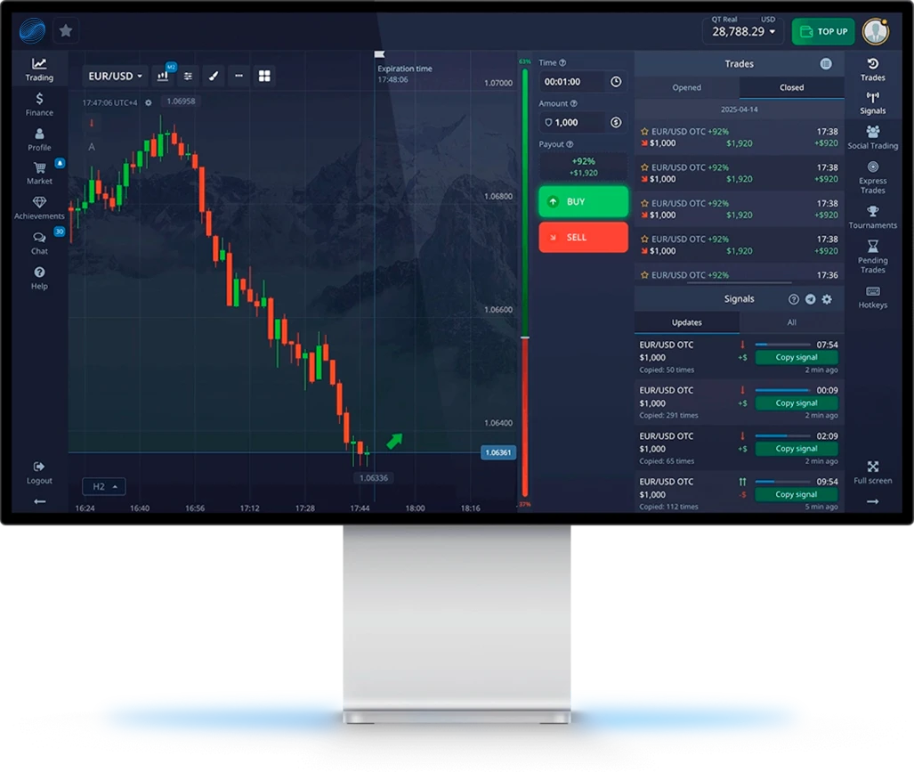 Latest trends: quick and digital trading, express trades, pending trades, copy trading. Payouts of up to 218%.